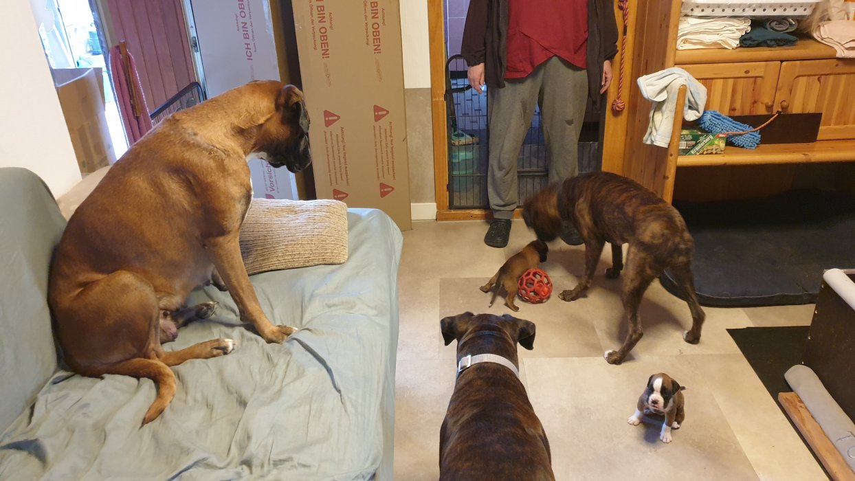 Nun ist das Rudel wieder komplett. Mama und die Tochter dürfen auch zu den Welpen.